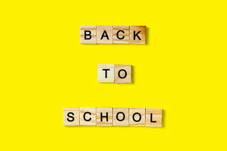 The inscription on the wooden squares in English letters is Back to school. It lies on a yellow background.