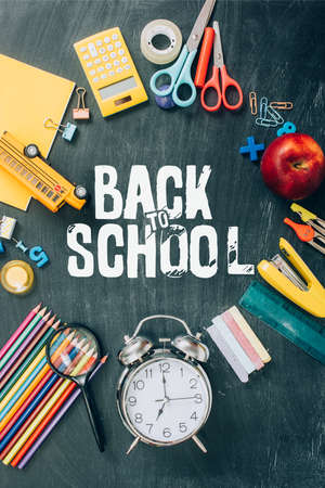 top view of frame with apple, toy school bus, vintage alarm clock and school supplies on black chalkboard with back to school lettering
