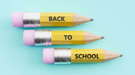 yellow pencils lined up with the words back to school carved on them. 3d render