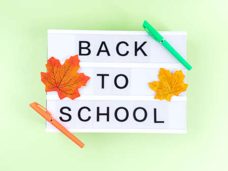 White lightbox with back to school text on green background with autumn leaves and pens. Starting new school year concept in autumn