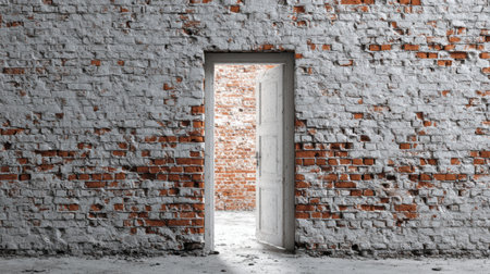 An open door set within a wall of bricks suggests a transition from restriction to freedom, inviting exploration beyond a limited environment.