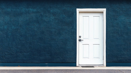A minimalist white door positioned on a textured blue wall, creating a striking contrast. Ideal for themes of simplicity, architecture, and design.