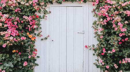 A charming white door surrounded by vibrant pink and colorful flowering vines, creating a picturesque and serene entrance perfect for seasonal decor.