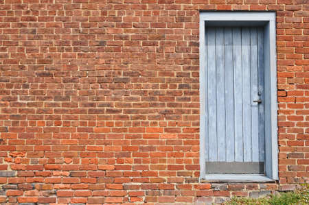 A bright red door on an old brick building, contrasted against the weathered texture of the bricks.