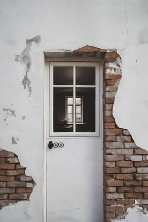 A close-up shot of a white door and window set into a crumbling wall, revealing brickwork.
