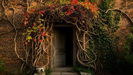 An old wooden door is framed by thick, twisting vines and roots growing against a weathered red brick wall. Autumn leaves add a touch of color to the mysterious and slightly spooky entrance, evoking a sense of fantasy or secret garden.