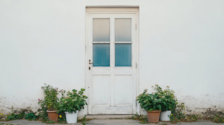 Scandinavian-style door with glass paneling and symmetrical low-profile potted plants