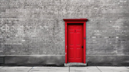 A minimalist urban design showcasing a vibrant red door against a dark brick wall.