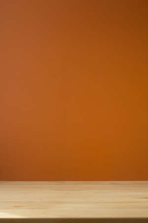 background, beige wooden table on orange background