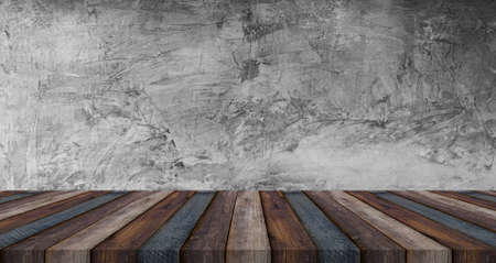 Empty brown wood table top on gray loft wall background . Template mock up for display of product