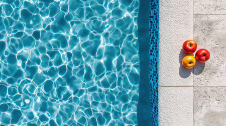 Ripe apples on swimming pool edge image, ai generated. Healthy summer snacks at poolside photography scene wallpaper. Dazzling water and fresh fruits on summer day concept photorealistic photo