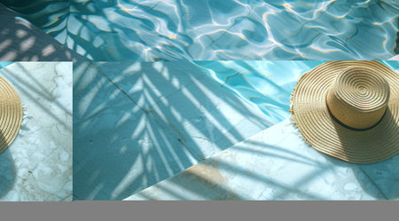 A hat, sunglasses, and a straw hat sit on the edge of a pool, ready for use under the sun.