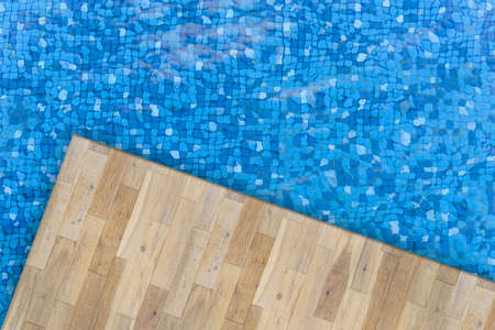 Top view of swimming pool and wooden board. water ripples on blue mosaic tiled bottom of swimming pool