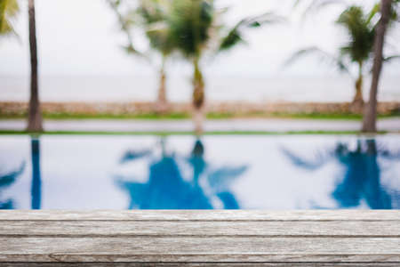 Empty wood table top and blurred swimming pool in tropical resort in summer banner background - can used for display or montage your products.