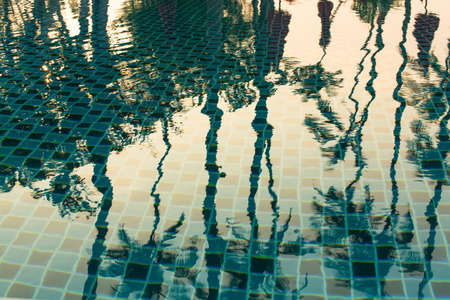 Coconut tree shadow on swimming pool water, tropical and hloiday concept background, outdoor day light
