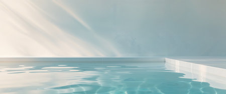 A serene image of a swimming pool filled with clear, tranquil blue water. The water appears calm with gentle ripples and reflections of light.
