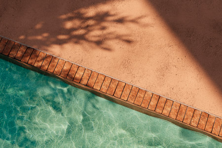 Top view of orange poolside in luxury hotel villa with sunlight shadow and swimming pool. Summer tropical background for product placement podium mockup.