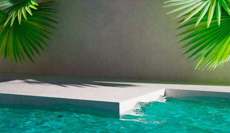 Summer tropical background with swimming pool water and plaster podium stage with palm leaf shadow. Luxury hotel poolside showcase table for beauty, cosmetic, spa, body and skincare product placement.