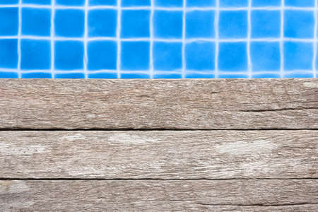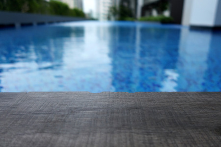 Empty blue wooden surface near swimming pool with clear water. space for design