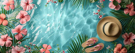 Summer background with tropical leaves, flowers, hat and flip flops