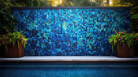 Tranquil Poolside Bliss: Blue Mosaic, Palm Tree Reflections, and Serene Travel Vibes