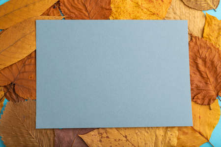 Composition with yellow and brown autumn leaves and blue paper mockup on blue pastel background. Blank, flat lay, top view, still life, copy space.
