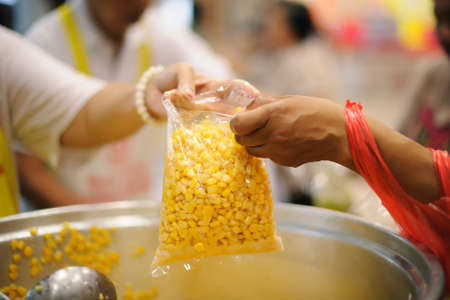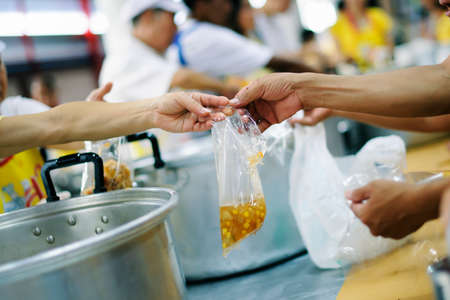 Providing free food to the poor Volunteers scooping out food to give charity to those who are hungry.