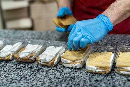 Confector's hands with pastry bag decorating delicious desserts