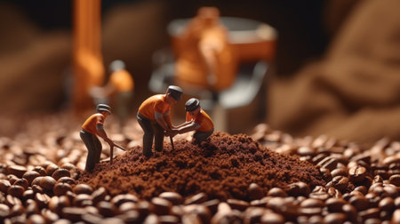 Small figures are hard at work, cleaning up a spilled pile of brown beans from a large bottle. Their colorful outfits add a lively touch to this playful scene. Creative teamwork shines through.