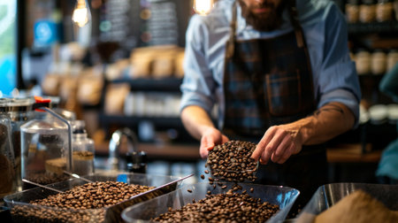 A barista scooping fresh coffee beans from a bin in a cozy coffee shop, with a background of brewing equipment. Perfect for coffee and lifestyle themes.
