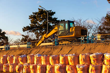 Hydraulic excavator on the bank in the sunlight