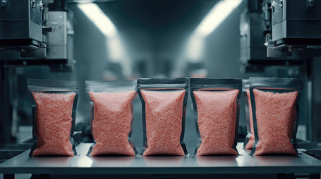 A detailed view of an industrial packaging machine at work, filling transparent bags with grains in a food production facility, showcasing modern automation.