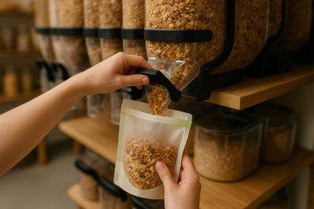 Woman filling reusable pouch with granola in zero waste shop, sustainable shopping in grocery store