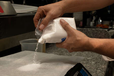 Hands of male chef dumping the ingredients of a recipe on an electronic scale to obtain the weight