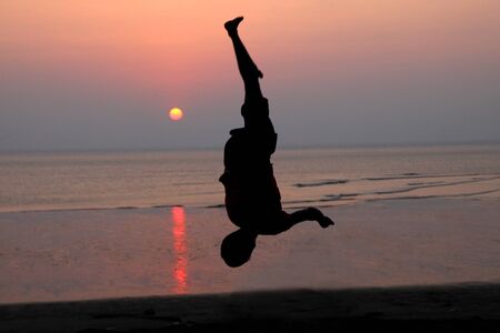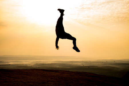 Silhouette of happy joyful young attractive man jumping and having fun against the sunset