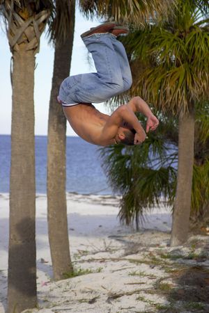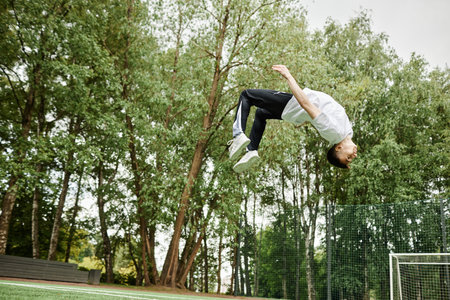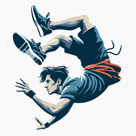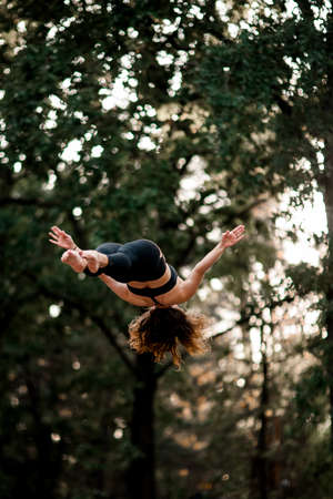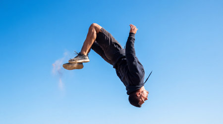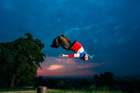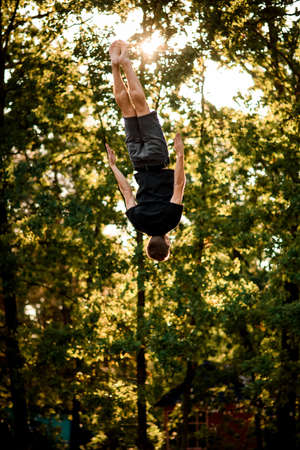 Latino man dressed in urban clothing doing a somersault in the air. He takes in the air of a young Hispanic man doing parkour. Latin boy in a park doing gymnastics. Hispanic man in an acrobatic pose.