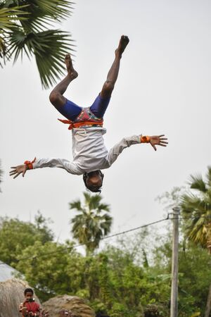 Chakta, West Bengal, India - April 17, 2019; Raibenshe, alternatively Raibeshe, is a genre of Indian folk martial dance performed by male only. This genre of dance was once very popular in West Bengal. Presently, it is performed mostly in Birbhum, Bardham
