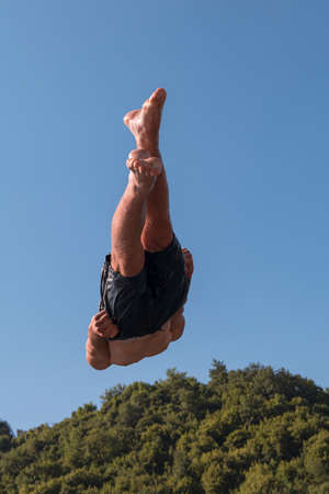 Young teen boy jumping flying and diving in the river. Clear blue sky and trees in distance as a natural background.