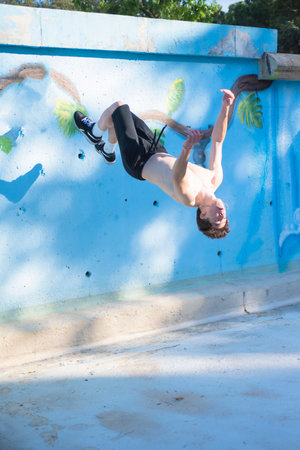 motivated man studies parkour on their own. full length side view photo.teenager is fond of extreme sport