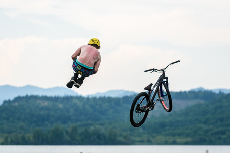 Velenje, Slovenia - June 24, 2017: Pljusk na Velenjski plazi extreme sports lake jumping competition event. Different extreme activities including slip and slide, bike, skate and roller ramp jumping in the lake.