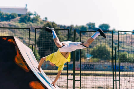 Bmx rider doing trick on ramp in skate park. Sports, extreme sports, freestyle, the concept of outdoor activity.