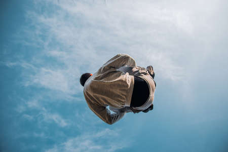 young modern hip hop style dancer jumping and dancing on blue sky background