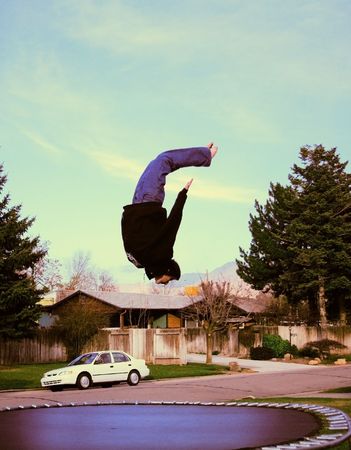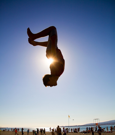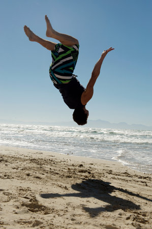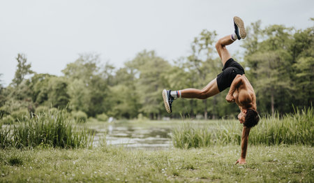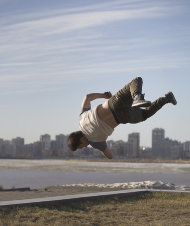 Young man doing a side flip or somersault while practicing parkour on a lake in the countryside.