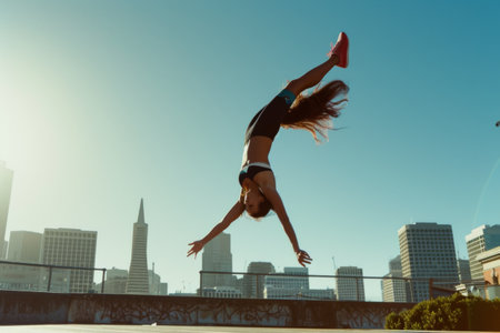 A skilled urban sportswoman defies gravity by doing a handstand on a skateboard in the city.
