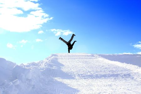 a man jumping over white clouds and blue sky. Challenge, risk, freedom and imagination concept