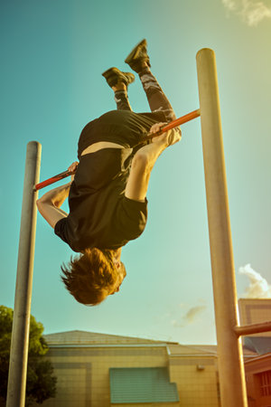 Active and healthy lifestyle. Portrait of a young man doing exercises on a horizontal bar on the sports ground. Sports outdoor.