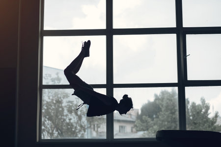 Boy dancing breakdance mid-air in studio. Acrobatic dancer.