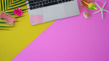 Top view of colourful summer workspace with laptop computer and office supplies on pink and yellow desk background