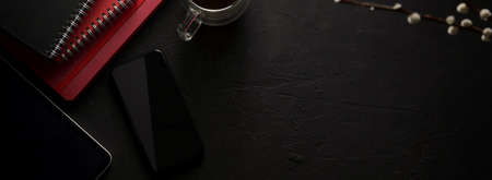 Top view of stylish workspace with tablet, smartphone, coffee cup, red and black notebooks and copy space on black table
