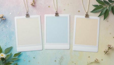 Three empty polaroid frames dangle from strings on a soft pastel backdrop, surrounded by delicate flowers and leaves.